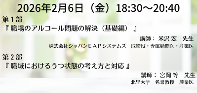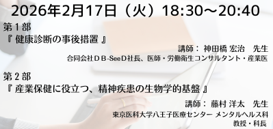 | 『職場で問題となるメンタルヘルス~専属精神科産業医の立場から~(PART-1)』 『テレワークに伴うオンライン化による保健指導(オンライン面談など)』 ※開催中止 |