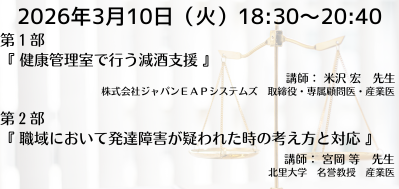 | 『職場におけるメンタルヘルス うつ病、発達障害、適応障害/職場におけるメンタルヘルスの予防的取り組み』 | 2022年 7月11日(月) |