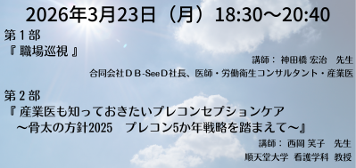 「職場巡視」 「産業医も知っておきたいプレコンセプションケア ~骨太の方針2025 プレコン5か年戦略を踏まえて~」と題してご講演いただきます。